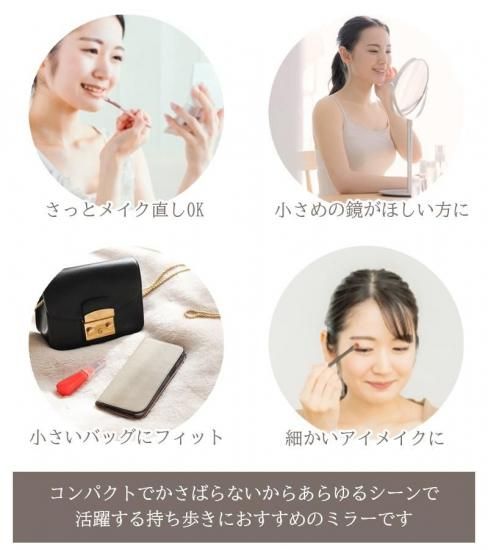 このコンパクトミラーは、化粧直しや髪型チェックなど、いつでもどこでもさっと使えるので、外出先や旅行先でも大活躍します。